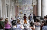 Rio de Janeiro (RJ), 14/01/2025 -Teatro Municipal / Visita - Vosota Teatralizada no Theatro Municipal. Atores: Lucas Salustriano (violão), Gabreil S'Antanna, Sophia Fried (com camisa vinho) e Adass Martins (roupa branca e verde)...O Pano de Boca do Teatro Municipal do Rio de Janeiro, entitulado “A Influência das Artes na Civilização” pintado por Eliseu Visconti em 1908. Foto: Marcelo Theobald / Agência O Globo